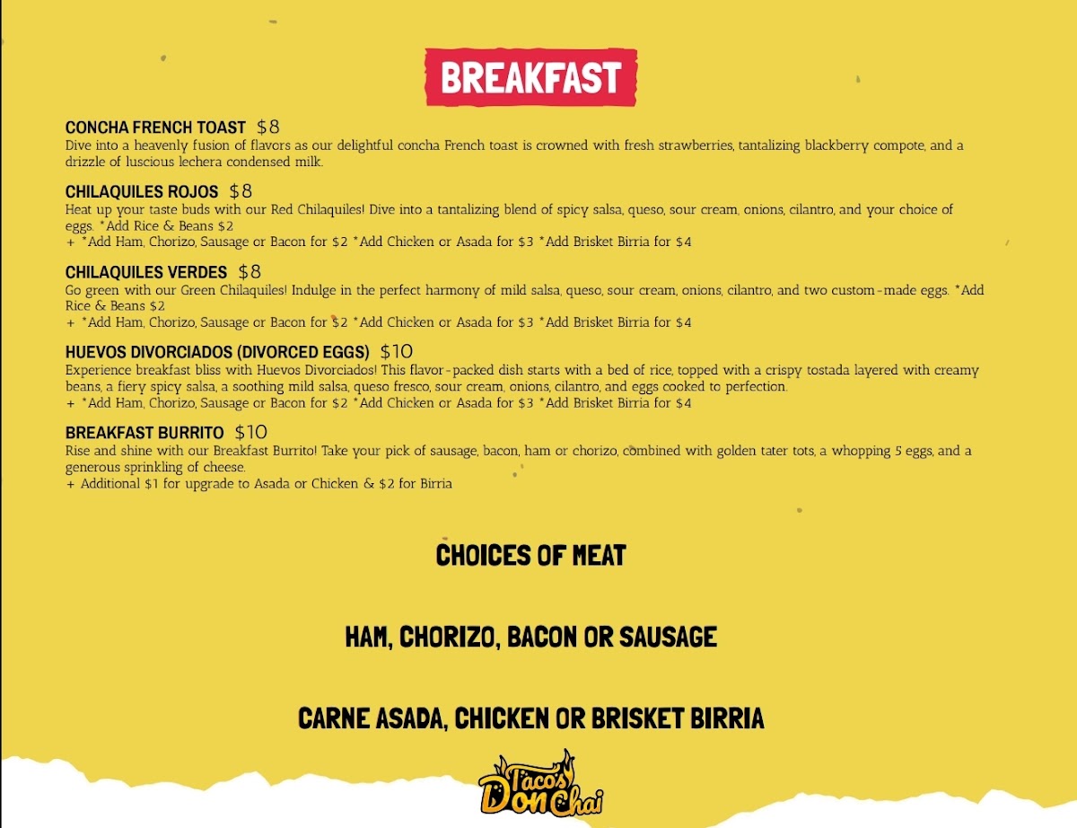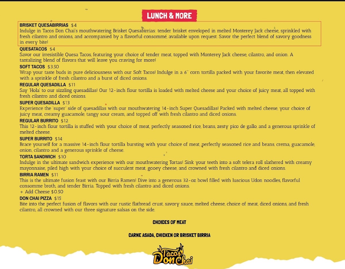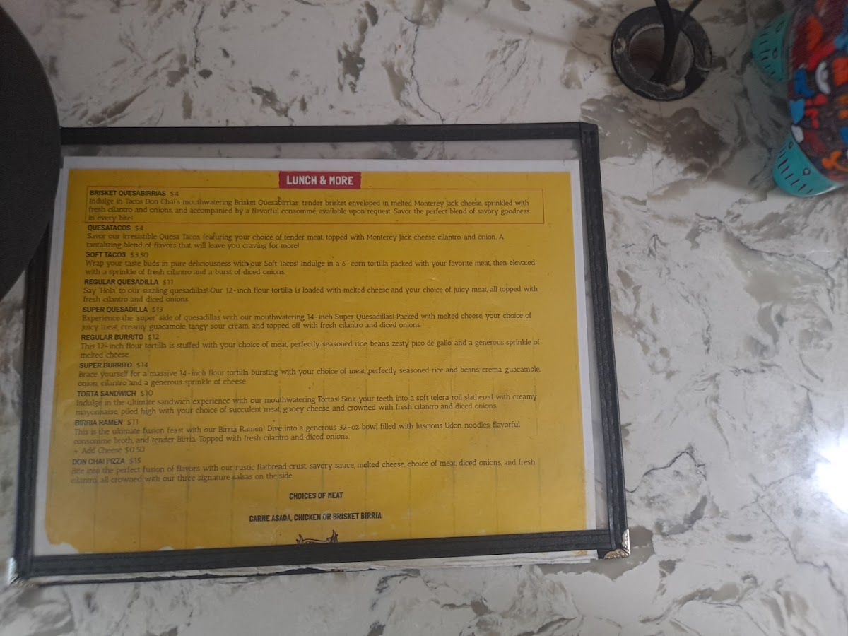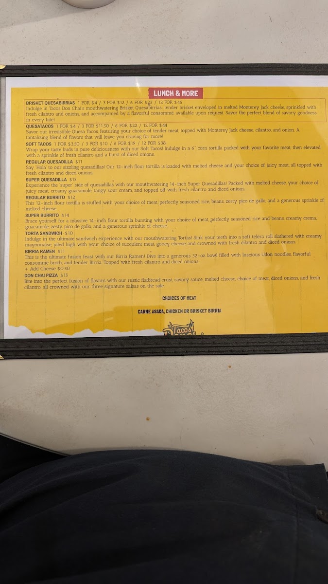 When it comes to the menu, Tacos Don Chai delivers on quality with a selection that makes it hard to choose. Among the standout offerings, their Brisket Quesabirrias (only $4.99) and Super Burrito ($14.99) have been described as nothing short of spectacular. The quesabirrias, with their rich, melty cheese and tender, flavorful brisket, are a must-try. For something a bit different, don’t miss the delightful Don Chai's Pizza ($15.99), showcasing the restaurant's creativity in combining beloved flavors.